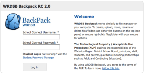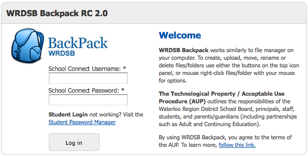 WRDSB has recently introduced the ‘BackPack’ option for secondary school students. This web site provides a mechanism for students to access their Board computer file storage from home. The login process is active directory compliant.