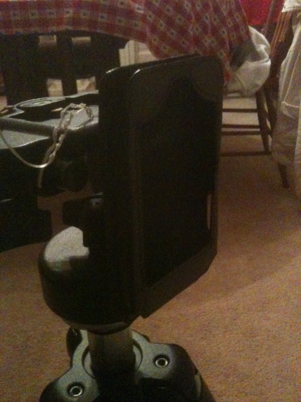 I was sure I would not hold the phone still enough, so needed to come up with a stabilizer of some sort. I removed the snap cover from my iPod case and twist tied it to a camera tripod…. and presto, a streaming pouch for the iPhone.