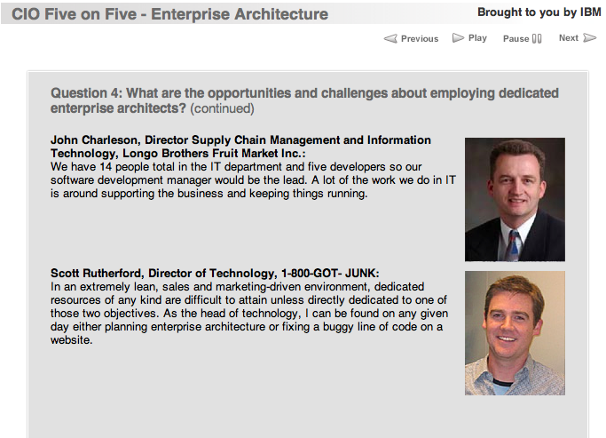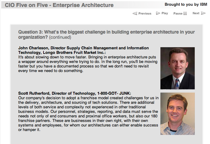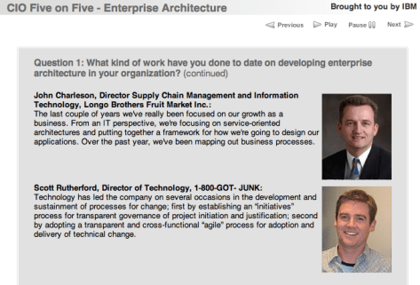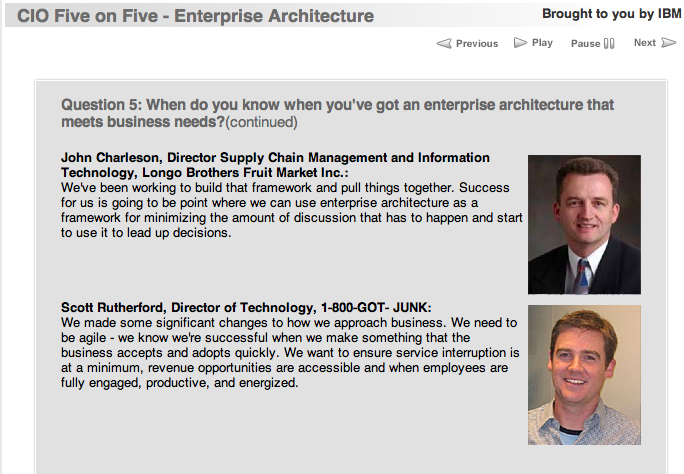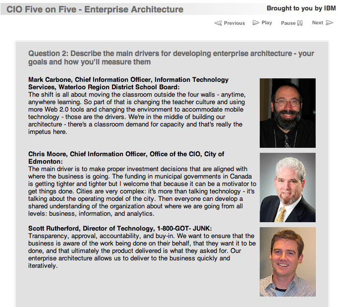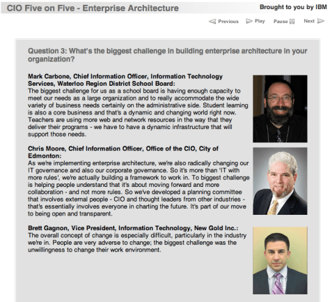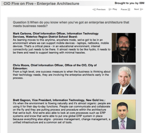 This past summer I had an opportunity to participate in an interview process with IT World Canada.  The format is 5 on 5 — 5 questions for 5 people. The IT strategy 5 on 5 discussion on enterprise architecture development is captured below  (with permission).